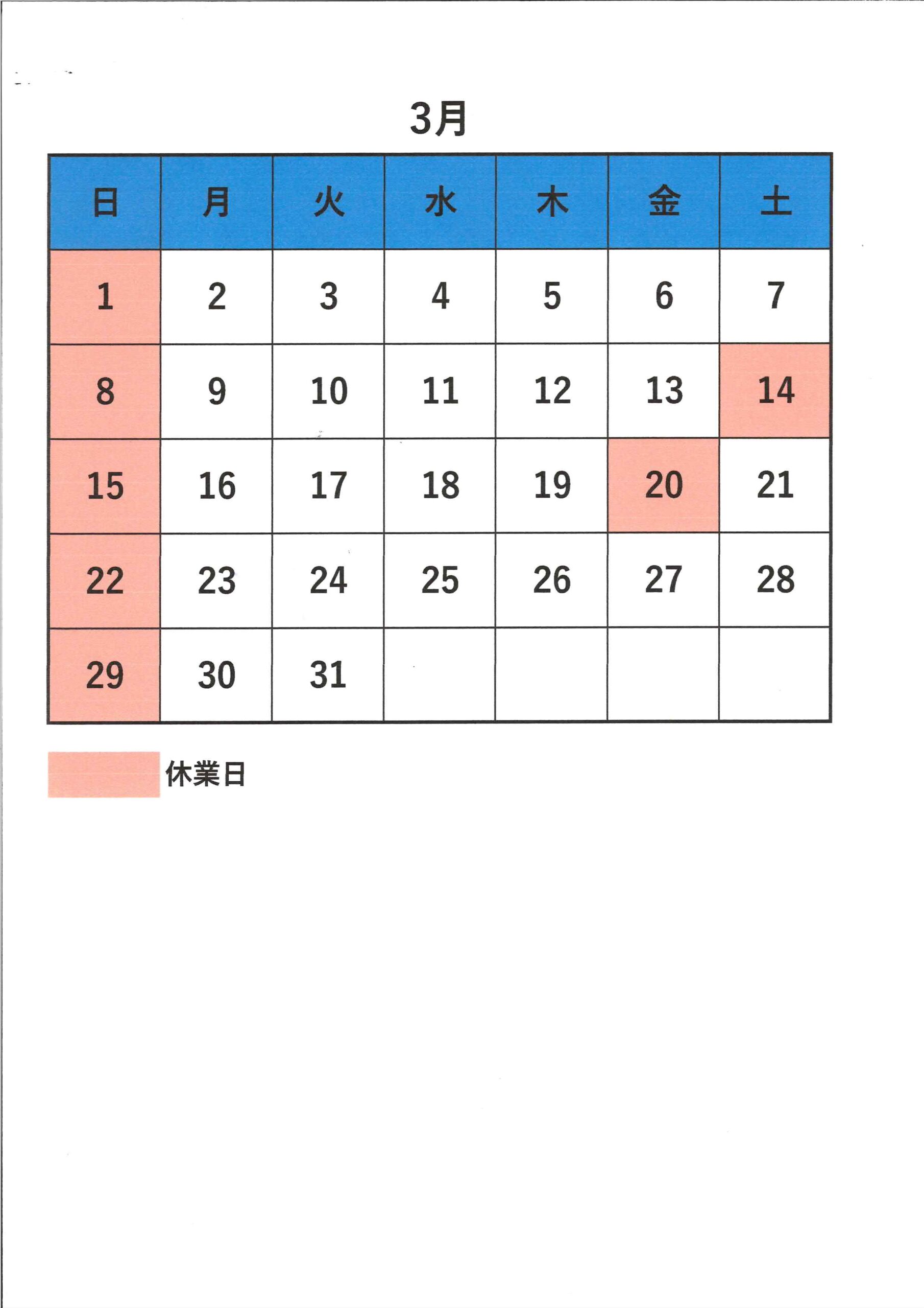 2026年3月 営業カレンダーのお知らせ